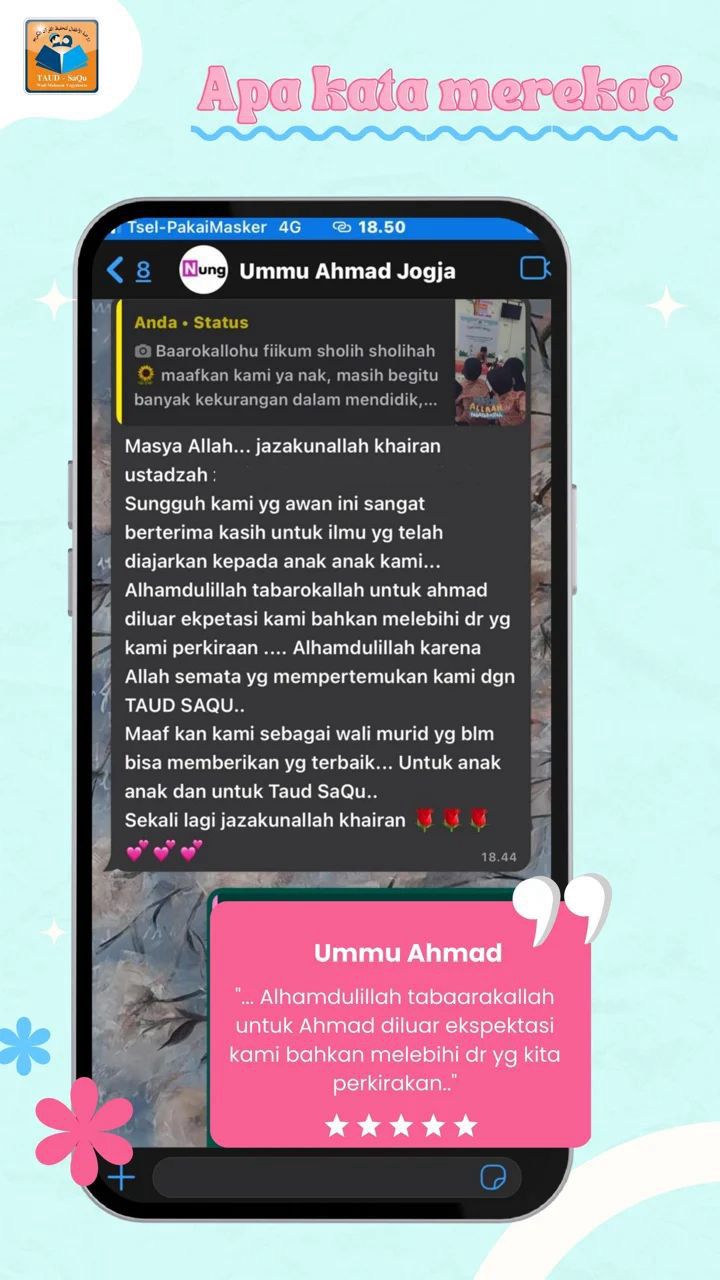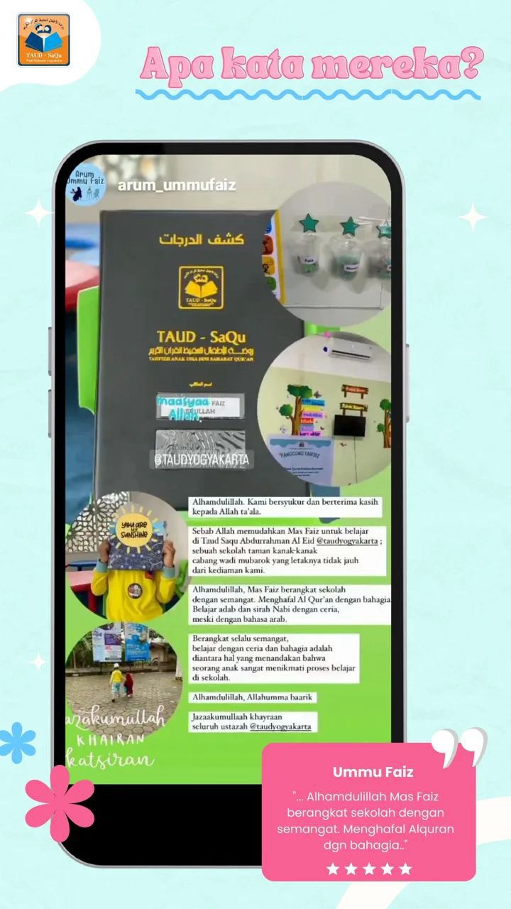 Testimoni bunda Zehan“Salah satu metode yang baik untuk mengembalikan kejayaan islam ialah dengan melahirkan generasi baru yang lebih baik dari kita, yaitu generasi Qur’ani yang akan menjadi generasi yang senantiasa hidup dalam bimbingan wahyu.”